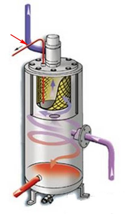 - работает, как отделитель основной массы масла от сжатого воздуха, т.к. масло-воздушный поток попадает в резервуар из винтового блока по касательной к его цилиндрической поверхности – как бы «закручивается».